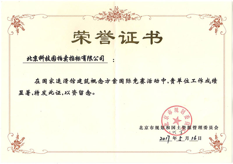 2022年國家速滑館建筑概念方案國際競賽榮譽證書