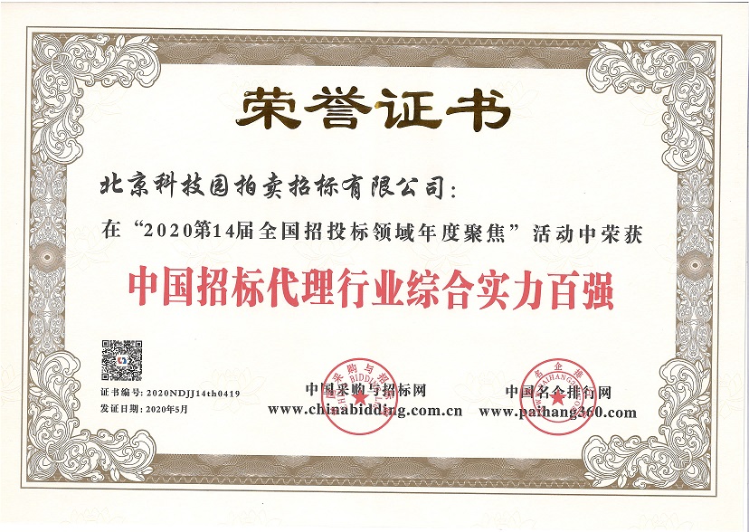 • 2020第14屆全國招投標領域年度聚焦“中國招標代理行業綜合實力百強”
