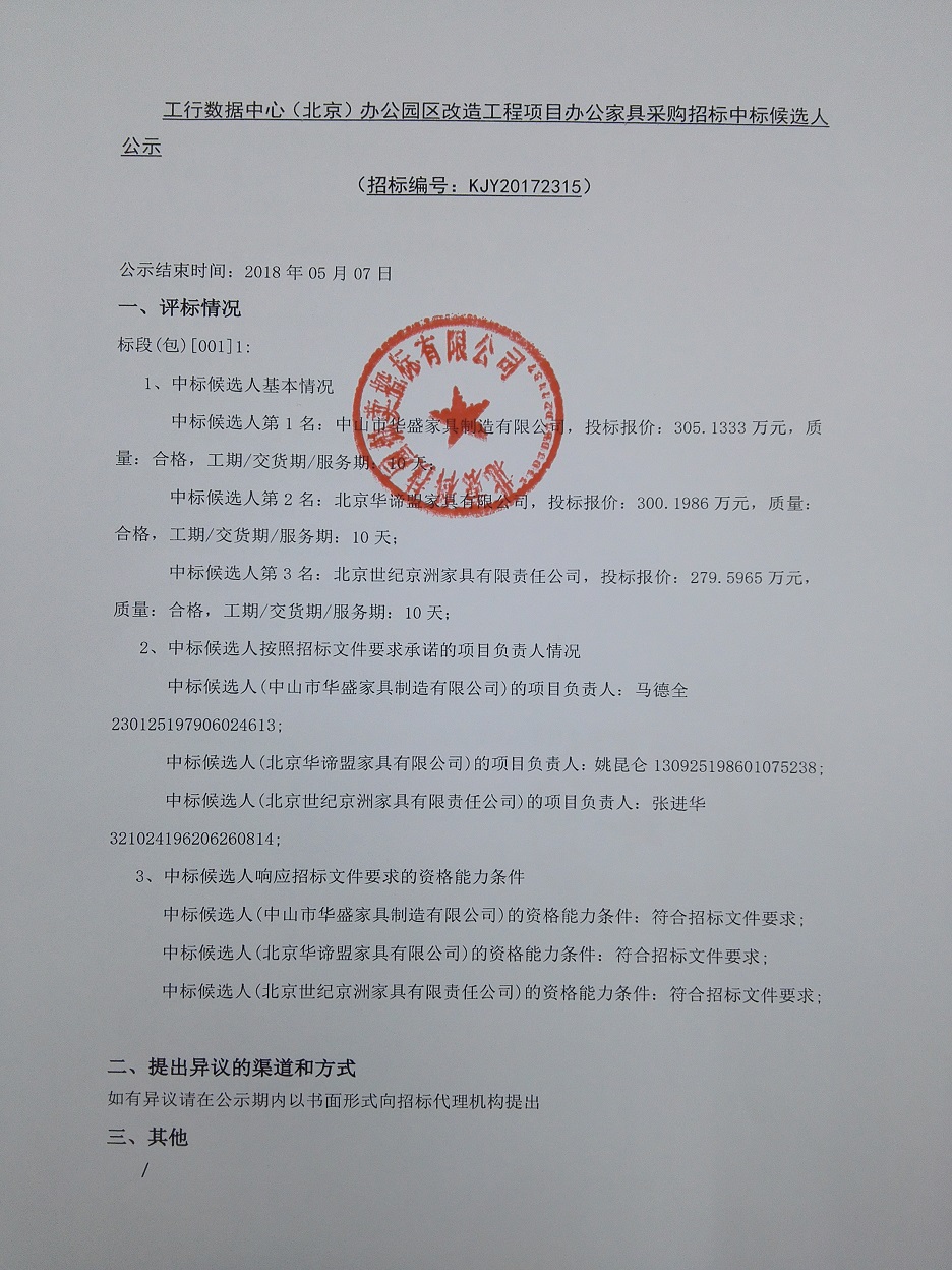 工行數據中心(北京)辦公園區改造工程項目辦公家具采購招標中標候選人公示